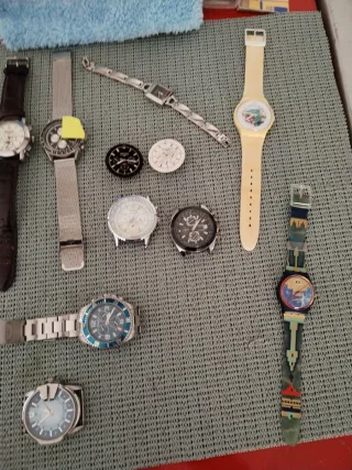 Lotto di orologi, ideali per chi cerca pezzi di ricambio o per imparare a ripararli. Presentano diverse finiture. - Orologio con cinturino in pelle marrone. - Orologio con cinturino in maglia d'acciaio. - Orologio da polso con quadrante rettangolare. - Orologio con quadrante bianco e indici neri. - Orologio con quadrante nero e indici rossi. - Orologio con quadrante bianco e numeri romani. - Orologio con quadrante nero e cronografi. - Orologio con cinturino in acciaio e lunetta blu. - Orologio con quadrante azzurro e numeri arabi. Visti e piaciuti non accetto Resi