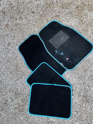 Set di tappeti per auto di colore nero, con un elegante bordo azzurro. - Quattro tappeti inclusi. - Design con fiori stilizzati e dettagli glitterati su uno dei tappeti. - Parte posteriore con grip antiscivolo.