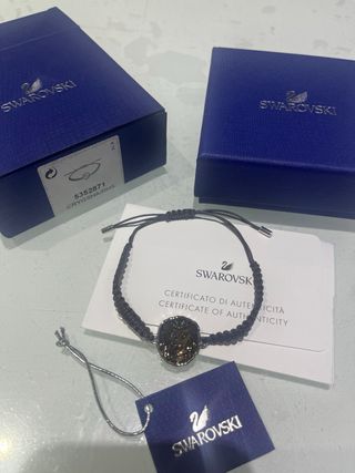 Elegante bracciale Swarovski con un design unico. - Charm centrale con finitura effetto pietra, raffigurante un leone. - Cordino intrecciato marrone. - Chiusura regolabile.