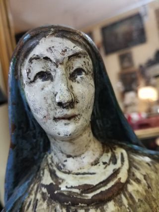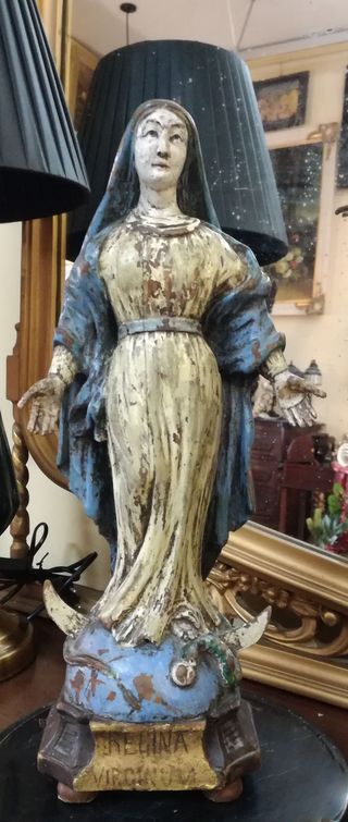 Vergine lignea tallada en madera policromada. Representa una figura religiosa con gran detalle. - Talla en madera. - Policromía original con signos de desgaste. - Base decorada con inscripción 'Regina Virginum'.
