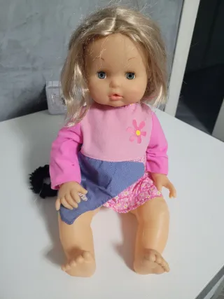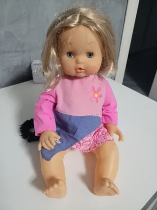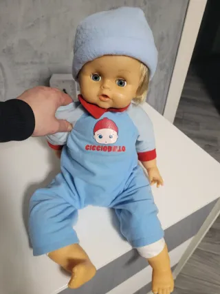 Bambola Cicciobello con tutina azzurra e cappellino. - Tutina azzurra con dettagli rossi. - Cappellino azzurro abbinato. - Dettaglio grafico sul petto. Ciocca di capelli tagliati