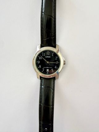 Elegante orologio da polso Lorus con cinturino in pelle nera e cassa in argento. 35mm. Look da aviatore REFERENZA VJ32-X024 - Quadrante nero con numeri arabi. - Resistente all'acqua fino a 50 metri. - Datario
