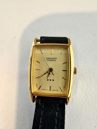 Orologio Orient da donna con cassa in oro da 19mm x 28mm. Movimento al quarzo. Cinturino in vera pelle nera con chiusura a bottone. REFERENZA D85HL8-40 BJ. CONDIZIONI OTTIME