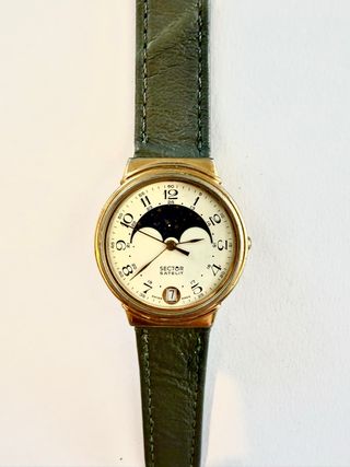 orologio satellitare Sector da donna con quadrante color crema e cassa dorata 37mm. Presenta una complicazione delle fasi lunari e un datario. MOVIMENTO AL QUARZO 5093 - Swiss made REFERENZA 51740086 - Quadrante con fasi lunari - Cinturino in pelle verde - datario CONDIZIONI OTTIME