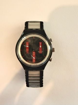 Orologio cronografo Swatch dal design distintivo di ispirazione orientale. Cassa da 35mm in plastica. Bracciale elastico coordinato. movimento al quarzo SWISS MADE in 1995 - Cassa e cinturino neri grigi - Dettagli rossi sul quadrante. - Movimento al quarzo. CONDIZIONI OTTIME