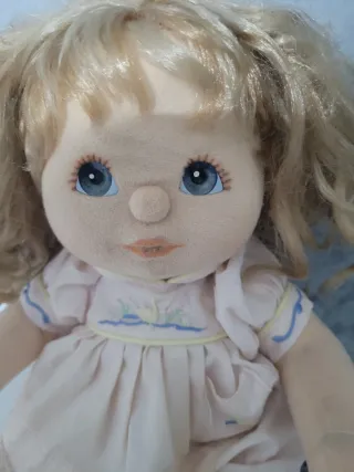 Bambola vintage in stoffa, con capelli biondi e vestito rosa. - Dettagli ricamati sul vestito. - Occhi azzurri dipinti. - Guance rosate.