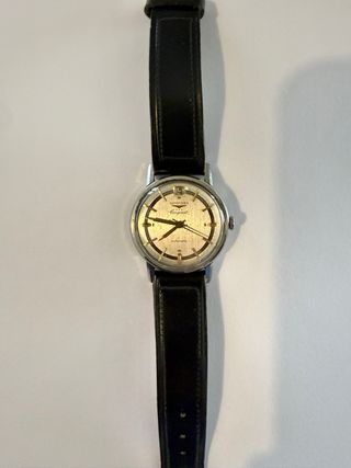 Orologio Longines Conquest automatico vintage (1960) Eccellente movimento automatico Longines cal. 291 di manifattura con 24 rubini. Quadrante con spazzolatura verticale, datario a ore 12, indici in oro. Cassa in acciaio inossidabile da 35mm con fondello decorato dall’iconico pesce e smalto verde. Cinturino in pelle nera non originale. REFERENZA: 9024 (conquest) Condizioni ottime per un vintage degli anni 60, presenta qualche graffio ma nessuna ammaccatura, o gravi danni, l’orologio è perfettamente funzionante.