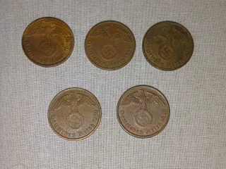 Lotto di monete del Terzo Reich, con diverse denominazioni e anni. - Monete in metallo con aquila e svastica. - Anni di conio: 1937, 1938, 1939, 1940, 1943, 1944 - Diverse dimensioni e colori, indicative dei materiali.