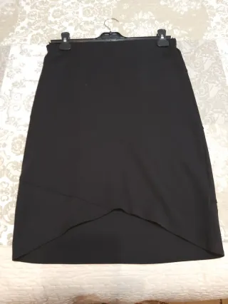 Gonna nera, perfetta per la stagione invernale. - Design asimmetrico con cuciture a vista. - Lunghezza al ginocchio con orlo a V.