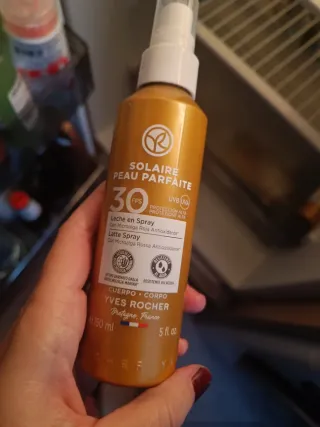 Spray solare Yves Rocher per una pelle perfetta con protezione SPF 15. - Protezione solare per corpo e viso. - Formato spray da 150 ml. - Fragranza piacevole.