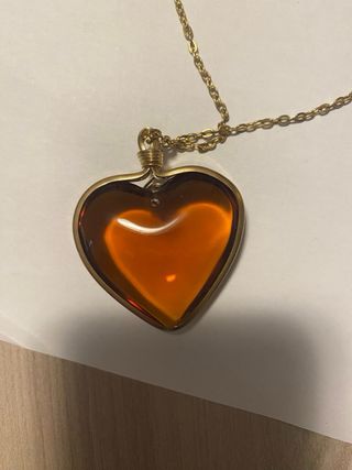Elegante ciondolo a forma di cuore con una pietra color ambra. - Montatura dorata. - Pietra trasparente con sfumature calde. - Filo metallico avvolto per il fissaggio.