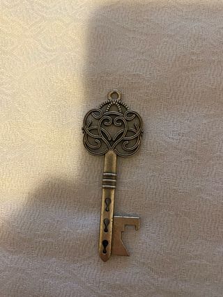 Portachiavi decorativo con un design ispirato alle chiavi antiche. - Finitura metallica color bronzo. - Dettagli traforati sul cappello. - Forma a chiave con elementi decorativi.