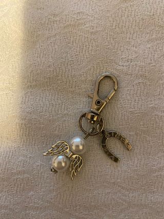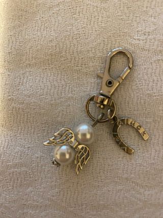 Portachiavi decorativo con ciondoli a forma di angelo e ferro di cavallo. - Ciondolo angelo con perle. - Ciondolo ferro di cavallo con incisione VICTORY LUCK.