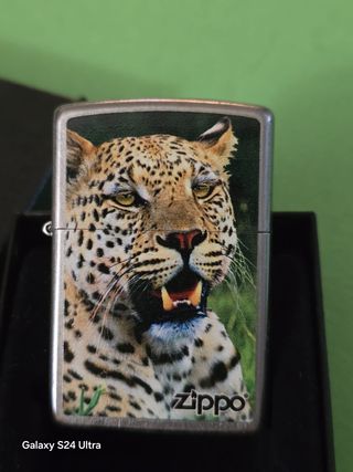 Accendino Zippo con una stampa dettagliata di un leopardo. Un accessorio distintivo per gli amanti degli animali selvatici. - Design con stampa di leopardo. - Marchio Zippo.