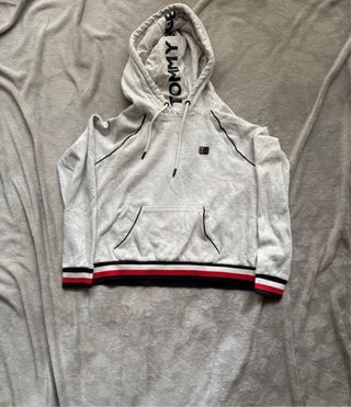 Felpa con cappuccio Tommy Hilfiger per bambino, colore grigio. - Logo Tommy Hilfiger sul cappuccio. - Dettagli a righe rosse, bianche e nere sui polsini e sul fondo. - Grande scritta sul cappuccio