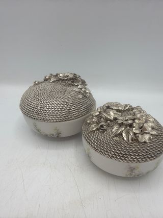Piccola scatola in porcellana con decorazioni floreali. - Coperchio in metallo resina argentato con motivo a intreccio. - Decorazioni floreali in rilievo sul coperchio. - Base in porcellana con delicati motivi floreali. - Ideale come portagioie o soprammobile. Misura scatola grande diametro cm 9 Diametro scatola piccola cm 7