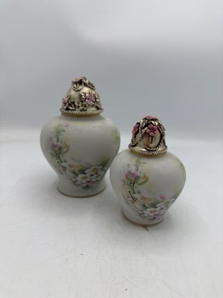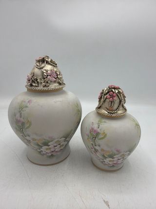 Delizioso set di due scatole decorative, perfette per piccoli oggetti. - Realizzate in porcellana e resina. - Decorate con motivi floreali - Tappo impreziosito da dettagli floreali in rilievo. -misure grande alta cm 14 -misure piccola alta cm 11