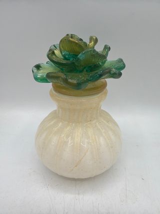 Raffinata bottiglia in vetro di Murano, impreziosita da un delicato fiore. - Realizzata in vetro di Murano in colore bianco oro e fiore verde oro . -il fiore si puo’ rimuovere e si puo’ utlizzare per profumazione pet ambienti. -alta cm 15