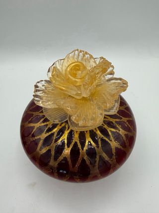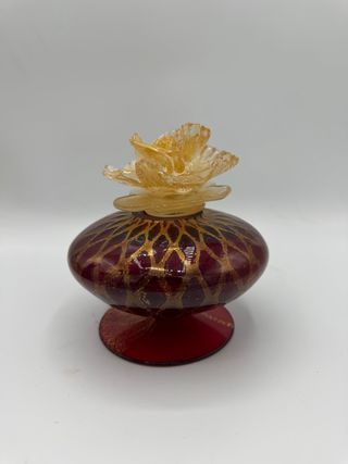 Elegante bottiglia in vetro di Murano, con una base rossa e decorazioni dorate. - Finitura lucida lavorazione a nido ‘ape - Tappo a forma di fiore in vetro trasparente e oro -alta cm 16 - diametro cm 13 circa