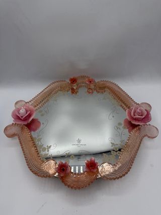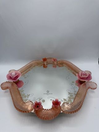Elegante vassoio in vetro di Murano, impreziosito da delicate decorazioni floreali. - bordi in vetro rosa lavorato. - Dettagli floreali in rosa opalino - Motivo floreale inciso sul vetro. Diametro solo dello specchio dm 30 Con i bordi arriviamo a 35
