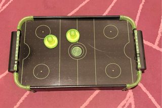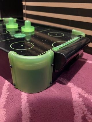 Tavolo da Air Hockey con finiture verdi. - Superficie di gioco nera. - Segnapunti integrati su entrambi i lati. - 2 racchette - 1 disco
