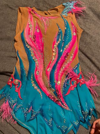 Body da ginnastica artistica, taglia S. Un capo unico e scintillante, perfetto per le competizioni. - Tessuto color carne trasparente. - Decorazioni con strass e paillettes. - Dettagli in rosa shocking e blu. - Applicazioni di piume rosa.