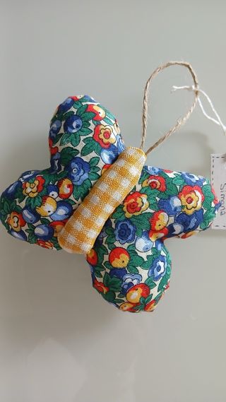 Deliziosa farfalla decorativa, perfetta per aggiungere un tocco di colore e allegria primaverile alla tua casa. - Realizzata a mano con tessuto fantasia. - Dettaglio centrale a quadretti gialli. - Cordino in juta per appenderla. Vivace farfalla in tessuto di cotone con fiorellini da appendere Realizzata a mano con cura e precisione Misura cm 11x9 Mai utilizzata praticamente nuova