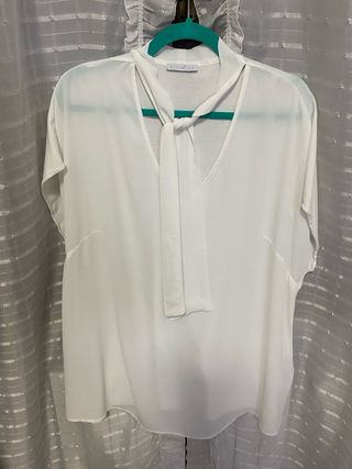 Elegante blusa da donna. - Scollo a V con fiocco. - Maniche corte. - Tessuto leggero e fluido.