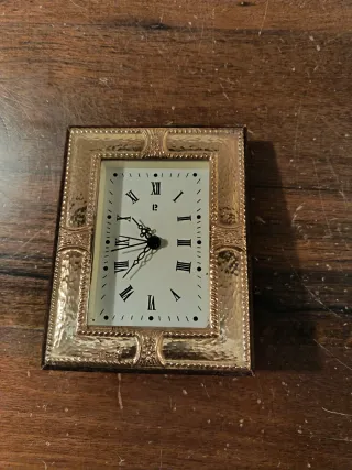 Elegante orologio da tavolo in legno con dettagli in metallo. - Quadrante rotondo con numeri arabi. - Movimento a carica manuale. - Design classico.