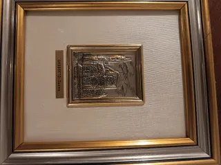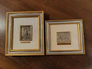 Set di due quadretti decorativi con cornici in oro e argento. - Raffigurano scene architettoniche. - Montati su tela di sfondo. - Targhetta identificativa con nome del luogo.
