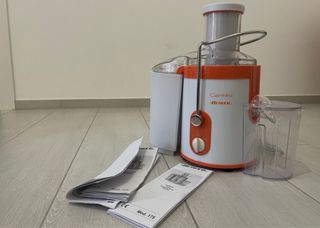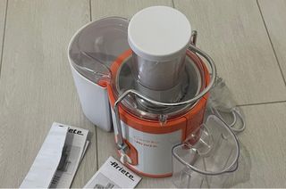Centrifuga Ariete Centrika modello 175, di colore bianco e arancione. Ideale per preparare succhi freschi. - Design moderno. - Include manuale di istruzioni.