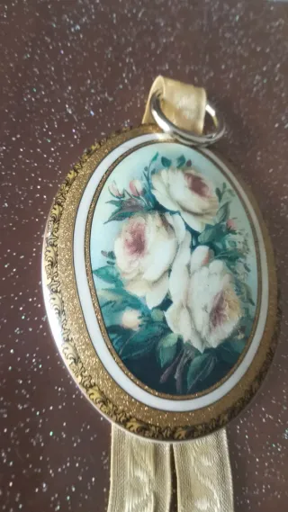 Medaglione ornamentale a forma ovale in porcellana limoges. Al centro c'è una pittura che raffigura un mazzo di rose bianche e rosa tenue, circondato da foglie verde scuro. L'immagine ha un bordo bianco e uno più esterno in oro con finiture decorative a rilievo. In cima, c'è un anello metallico a cui è legato un nastro di seta dorata e si può appendere oppure come oggetto decorativo, o fermacarte. Cm 7 x 9 (escluso nastro e gancio)