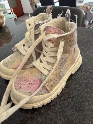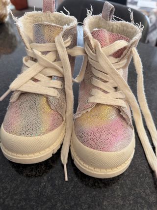 Stivaletti invernali per bambina con un allegro design arcobaleno. Perfetti per tenere i piedi al caldo. - Taglia 28. - Fodera interna morbida e calda. - Chiusura con lacci bianchi. - Dettagli glitterati.