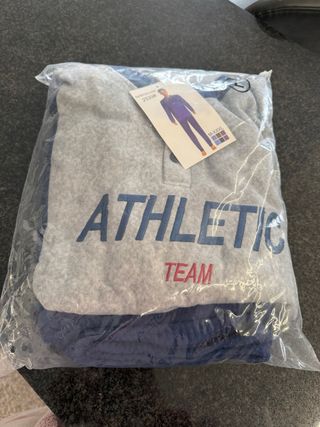 Pigiama da uomo in tessuto morbido, ideale per il relax. - Maglia grigia con scritta ATHLETIC TEAM blu e rossa. - Pantalone blu. - Chiusura con bottoni sul collo.