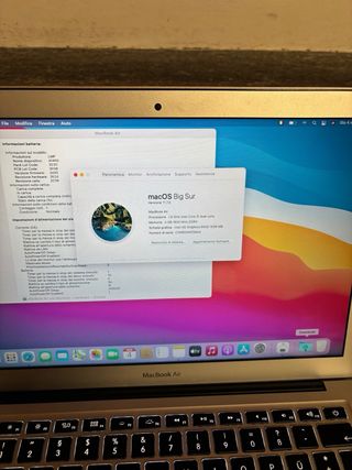 Vendo Apple MacBook Air 13” anno 2013 sistema operativo macOS Big Sur 11.7.6 processore intel core i5 memoria 4gb DDR3 archiviazione SSD 128gb veloce e silenzioso scheda grafica Intel HD graphics 6000 tastiera italiana porte USB Thunderbolt jack per cuffie lettore scheda SD fotocamera face time HD wi-fi bluetooth. C’è l’alimentatore originale non in perfette condizioni ma funzionante perfettamente. Il case esterno presenta minimi segni di usura. Non c’è la scatola originale. La batteria è stata sostituita con una originale e da quel momento non ho più usato il MacBook infatti presenta 1 ciclo di ricarica.
