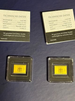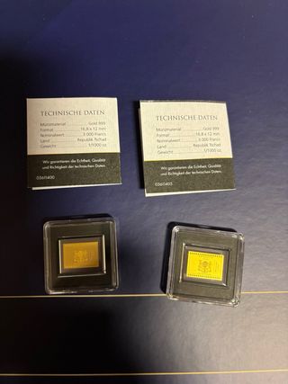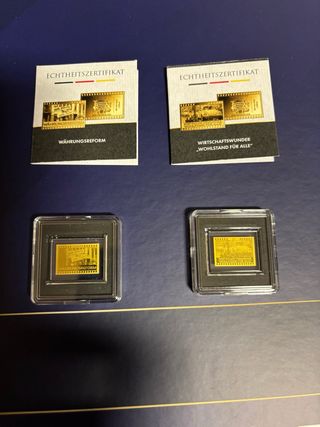 Due blister contenenti monete in oro fino 999 24k. - Monete in oro puro. - Certificato di autenticità incluso. Vendo 2 blister lamine oro fino 999 24k con certificato di autenticità dimensioni 16.8x12 mm del peso ognuna di 1/1000 di oncia incorniciati singolarmente con una a rappresentare la raffigurazione della Legge fondamentale tedesca e l’altra In ginocchio a Varsavia.