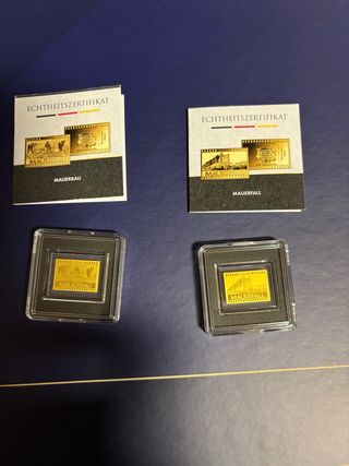 Due blister contenenti lamine d'oro puro 999. Ogni lamina è in oro 24 carati. Vendo 2 blister lamine oro fino 999 24k con certificato di autenticità dimensioni 16.8x12 mm del peso ognuna di 1/1000 di oncia incorniciati singolarmente con una a rappresentare la caduta del muro di Berlino e l’altra la costruzione di muri