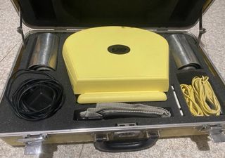 E-Meter, noto anche come elettropsicometro, in una valigetta. - E-Meter giallo. - Due cilindri metallici. - Cavi di collegamento gialli. - Alimentatore nero. - Tracolla in tessuto grigio.