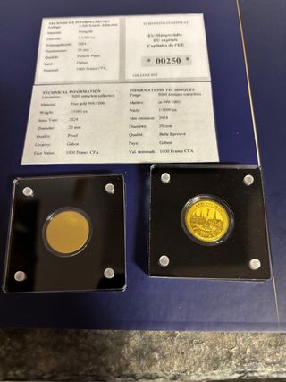 Set di 6 monete in oro puro 999/1000, coniate 2024 Vendo 6 monete oro fino 999 del peso di 1/1000 di oncia diametro 20 mm incorniciate singolarmente coniate in Gabon con certificato di autenticità a tiratura limitata ideali x completare una collezione. Incluso il cofanetto indicato nelle foto con certificato originale valido per tutte e 6. Le monete rappresentano Copenaghen e Vienna Praga Sofia Dublino e Nicosia