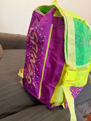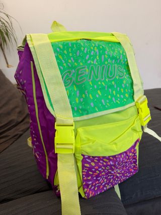 Zaino scolastico con un design vivace e accattivante, perfetto per portare con te tutto il necessario. - Colori principali: viola, verde fluo e giallo fluo. - Fantasia a pois colorati su diverse sezioni. - Scritta Genius in rilievo sulla parte frontale. - Spallacci regolabili con fibbie gialle. -Misure 40x20x30.