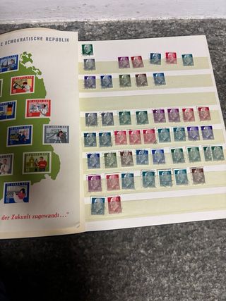 Album raccoglitore per francobolli EX Repubblica Democratica Tedesca (DDR). - Copertina blu. - Stemma dorato con corno postale. Vendo album raccoglitore francobolli con oltre 400 pezzi più di 20 foglietti e 4 buste Primo giorno tutti emessi da Ex DDR quindi prima del 2000 la maggioranza viaggiati ma anche alcuni esemplari nuovi. L’album ha 16 pagine bifronte per cui 32 pagine utilizzabili e ha le seguenti dimensioni: 24x31 spessore 2,5 cm. Altre foto a richiesta