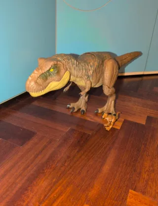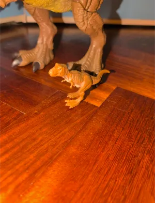 Set di due action figure di dinosauri T-Rex. - Un T-Rex adulto, che emette il ruggito, ma al momento ha le batterie scariche - Un cucciolo di T-Rex.