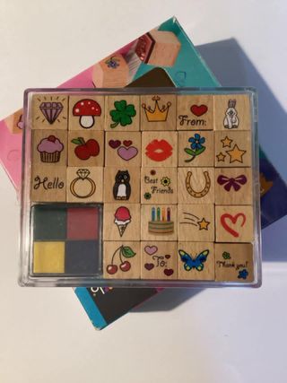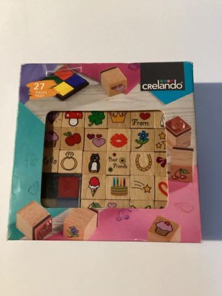 Set di 27 timbri in legno con varie fantasie, marca CRELANDO. - Include una piccola tavoletta per inchiostro con 4 colori. - I timbri presentano disegni come funghi, mele, corone, baci, pinguini, ciambelle, torte e altro ancora. - Alcuni timbri mostrano scritte come From: e Best Friends.