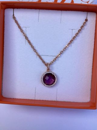 Collana boccadamo da donna della collezione SHARADA. Collana in bronzo placato oro rosa con pendente composto da cristallo ametista incastonato su base di zirconi. Lunghezza cm.38 estensibile sino a cm.43,5. Chiusura con moschettone, l'oggetto viene fornito con scatola e busta originale e certificato di autenticità. Nuova mai usata
