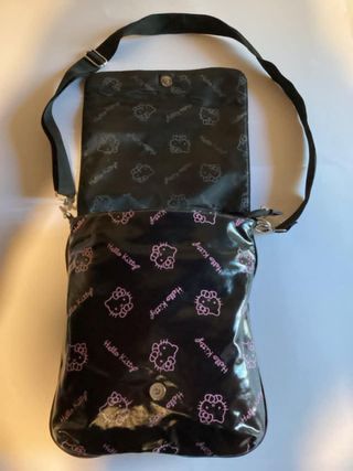 Hello Kitty Borsa modello messenger, Nera vernice lucida con stampe rosa, con tracolla regolabile, all'interno tasca con chiusura a zip, marca Sanrio originale, usata pari a nuovo