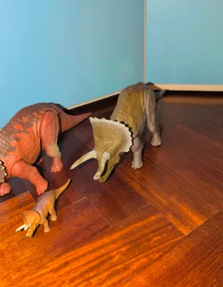 Set di tre dinosauri Triceratops, ispirati a Jurassic World. Include un esemplare adulto più grande e due più piccoli. - Dettagli realistici. - Ideali per collezionisti o per il gioco.