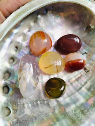 Bellissima conchiglia di abalone con sei pietre naturali. - Conchiglia di abalone di circa 12 cm. - Sei pietre naturali incluse. - Le pietre hanno colori e forme diverse.