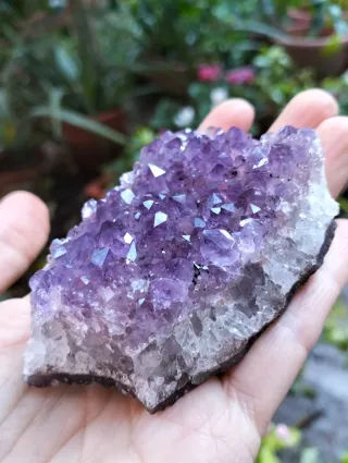 Splendido esemplare di Ametista dell' Uruguay con cristalli viola intenso da 137 grammi e una tormalina nera inclusa. Un pezzo unico per collezionisti. - Peso: 137 grammi. - Provenienza: Uruguay. - Cristalli di ametista. - Incluso un esemplare di Tormalina Nera