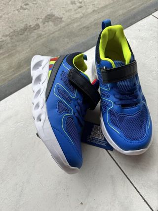 Scarpe da ginnastica per bambino/a, taglia 33. - Colore blu con dettagli lime. - Chiusura con velcro. - Tomaia in mesh traspirante.