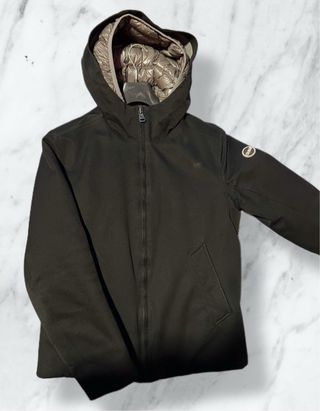 Giacca imbottita Woolrich in colore nero con dettagli verde oliva. - Chiusura frontale con zip e bottoni. - Tasche laterali con zip. - Collo alto. - presenta qualche segno di usura come si evince in foto.